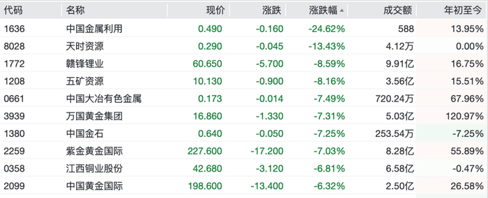 有色金属板块跌幅居前,五矿资源、赣锋锂业跌逾8%,江西铜业股份、紫金黄金国际跌超6%,金力永磁跌超5%,洛阳钼业、紫金矿业跌逾4%。