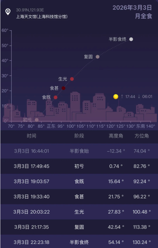 选对观测地:全食开始时月亮高度较低,优先选东方地平线无遮挡、远离市区强光的开阔地,楼顶、江边、公园都是绝佳选择。