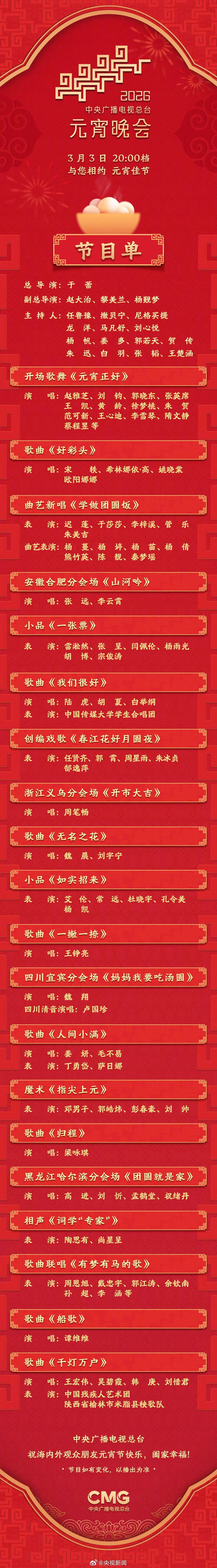今晚8点档,中央广播电视总台《2026年元宵晚会》将在央视综合频道(CCTV-1)、综艺频道(CCTV-3)、中文国际频道(CCTV-4)、戏曲频道(CCTV-11)、音乐频道(CCTV-15)以及4K超高清频道、8K超高清频道等电视频道,音乐之声、经典音乐广播、文艺之声、大湾区之声、台海之声、华语环球广播、南海之声等广播频率,央视新闻、央视频、云听客户端和央视网、央广网、国际在线等新媒体平台同步播出,陪伴全球华人和海外朋友共度团圆喜乐、温馨和美的元宵佳节!