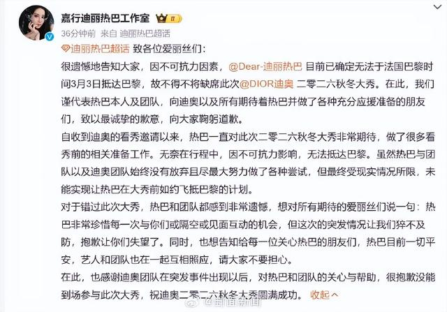 3月3日,@嘉行迪丽热巴工作室 发文称,因不可抗力因素,@Dear-迪丽热巴 目前已确定无法于法国巴黎时间3月3日抵达巴黎,将缺席时装周。工作室称热巴目前一切平安,艺人和团队也在一起互相照应,请大家不要担心。