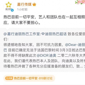 3月3日,迪丽热巴对接转发工作室微博,并发文热巴已在安全区域,请大家放心。此前工作室发文迪丽热巴因不可抗力影响,无法抵达巴黎,将缺席大秀。