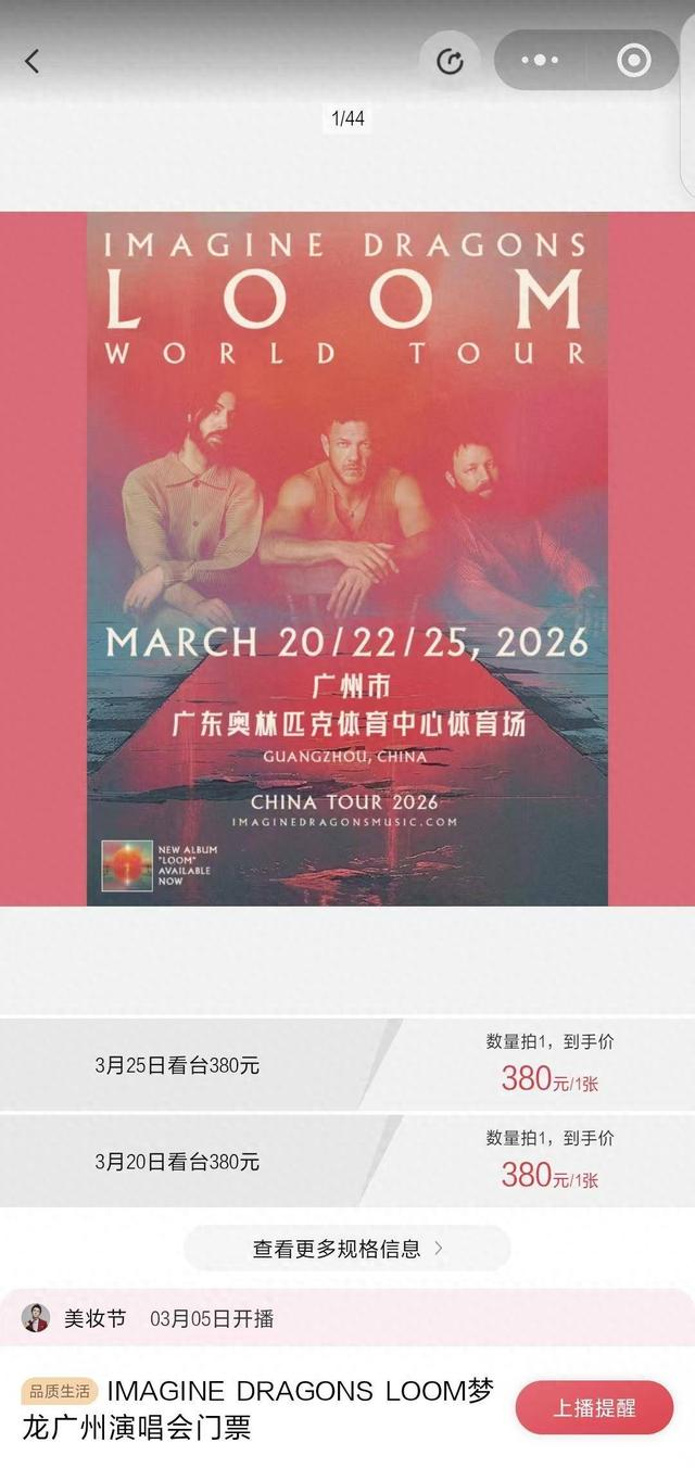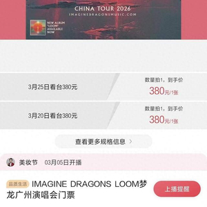 根据有源文化公开信息,此次梦龙乐队在国内的巡演有三站,分别为上海、广州、成都,上海站此前已开票并售罄,官方票务平台为大麦和携程。成都站将在3月6日晚开票,官方票务平台为大麦、携程、芋圆YuYuan、票蜜蜂、飞猪,成都站尚未官宣是否上架李佳琦直播间。