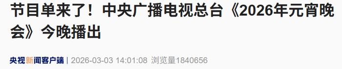 节目单来了!中央广播电视总台《2026年元宵晚会》今晚播出