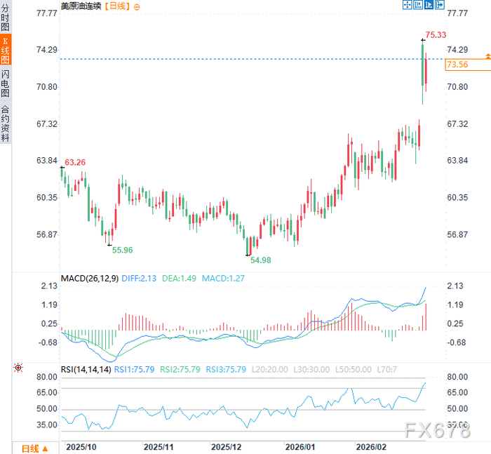 冲突升级引发全球避险情绪飙升。日本东证指数跌幅扩大至2%,韩国KOSPI指数下跌超3%;A股三大指数集体回调,沪指、深证成指、创业板指均跌逾1%,下跌个股近4200只。道指微跌,纳指和标普500小幅反弹,但整体成交活跃于能源、国防板块。美元指数一度走强至1月20日高点98.98,周一(3月2日)美原油价格一度跳涨逾12%,触及75.33美元/桶的近九个月高点,周二美原油价格震荡上行,现交投于每桶74.00美元附近,日内涨幅约3.85%。