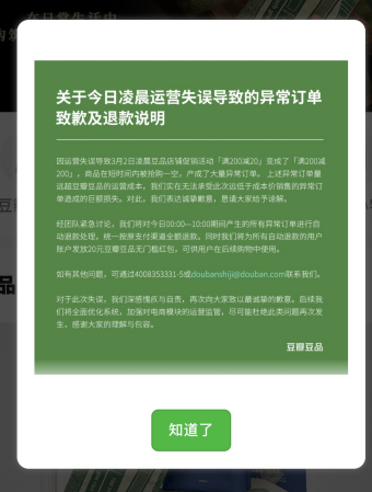 面对上述情况,豆瓣豆品决定对3月2日00:00—10:00期间产生的所有异常订单进行自动全额退款,退款将按原支付渠道返还。同时,为改善用户体验,平台将为所有自动退款的用户账户发放20元豆瓣豆品无门槛红包,可用于后续购物使用。