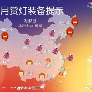 2026年元宵节夜间,我国大部地区以多云或阴天为主,仅青海、西藏、甘肃中南部、陕西中北部、山西西部及内蒙古东部等地区天气晴朗,适宜观赏“红月亮”与花灯交相辉映的奇景。南方大部、东北及新疆北部等地云量较多或伴有雨雪,可能影响赏月,其中福建、重庆、广东东南部及海南等地将出现“雨打灯”现象。