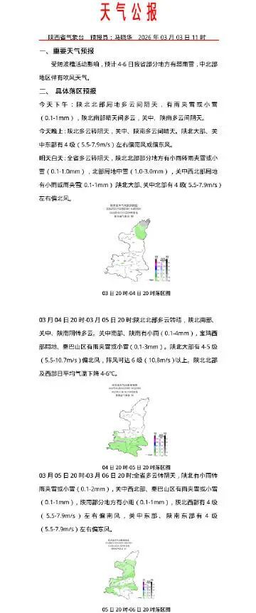 受短波槽活动影响,预计4-6日陕西省部分地方有弱雨雪,中北部地区伴有吹风天气。