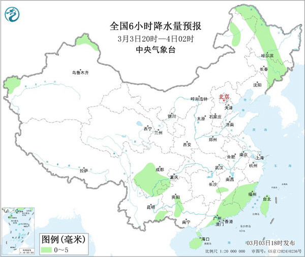 今天20时至明天2时,我国大部地区降水较少,仅四川南部、海南、广东东部、福建南部、台湾等部分地区有降雨,外出注意携带雨具。