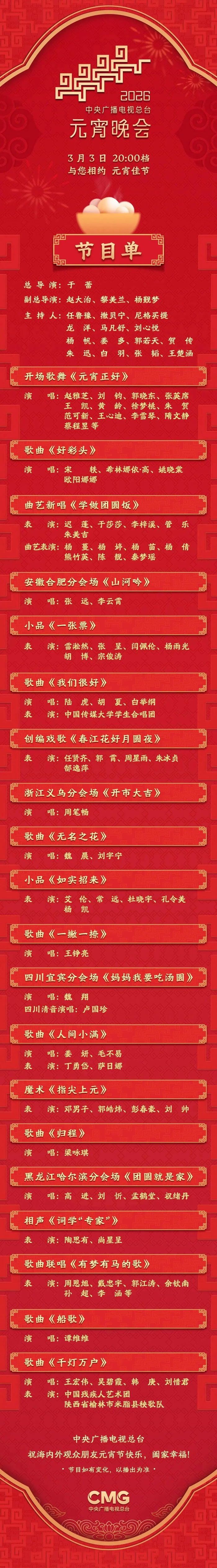 元宵晚会节目单来了! 重庆发布 重庆市人民政府新闻办公室官方账号 03.0318:42 关注 花灯映月圆,万家共此时中央广播电视总台《2026年元宵晚会》将于今晚8点档与海内外观众见面节目单正式发布一起来看