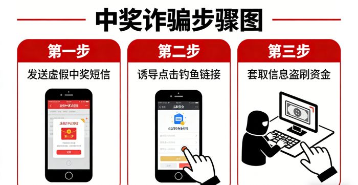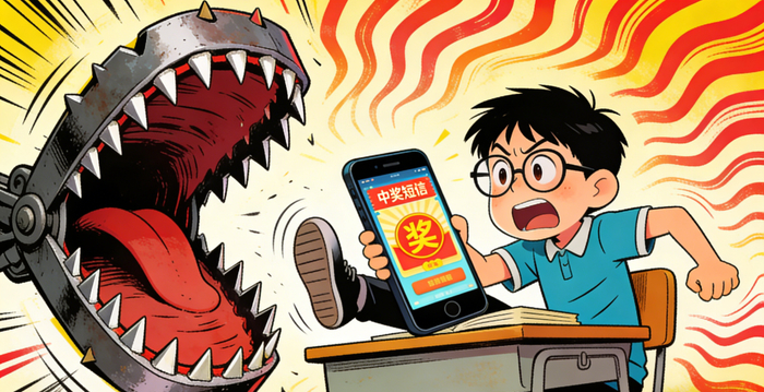 一、广撒网引流:诈骗分子通过短信、社交软件私信、短视频评论区等渠道,批量发送中奖信息,精准瞄准学生和家长群体。