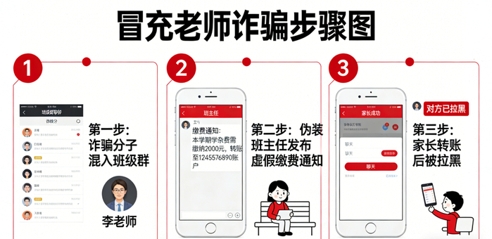 一、前期渗透:诈骗分子通过非法渠道购买家长联系方式、班级群二维码,或伪装成 “新生家长”“转学生家长” 申请加入班级社交群,入群后潜伏观察,记录班主任的昵称、说话语气、常用话术。