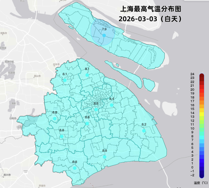 刚刚入春的上海今天仍寒意十足。今日冷空气控场,阴云密布,各区最高气温被压制在7~9度,市区徐家汇站最高8.5度。北风阵阵,局部最大阵风达5级,体感阴冷。今夜云系仍较多,观赏“月全食”难度较大,但不影响外出赏花灯。