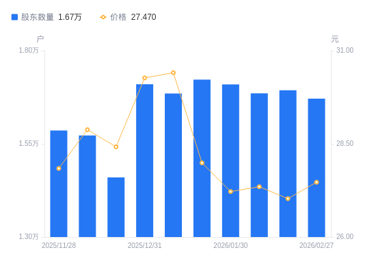 近一年(2025年2月28日至2026年2月27日),鸿合科技A股股东户数从1.97万户,减低至1.67万户,降幅14.99%,区间股价上涨11.52%。