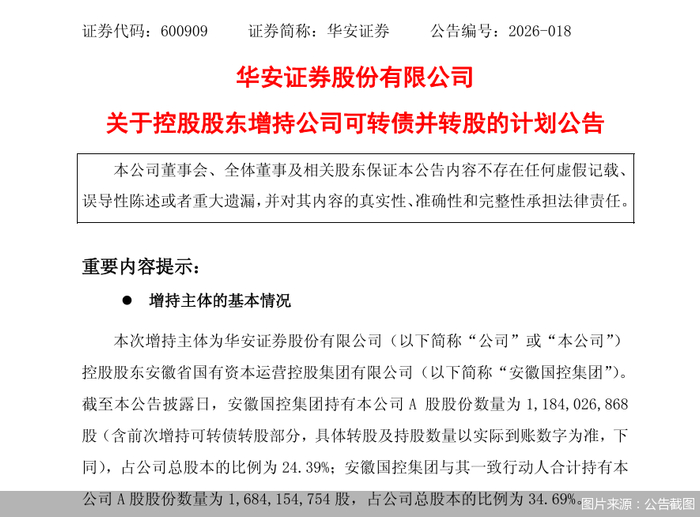 截至公告披露日,安徽国控集团持有华安证券A股股份数量约为11.84亿股(含前次增持可转债转股部分,具体转股及持股数量以实际到账数字为准,下同),占公司总股本的比例为24.39%;安徽国控集团与其一致行动人合计持有华安证券A股股份数量约为16.84亿股,占公司总股本的比例为34.69%。