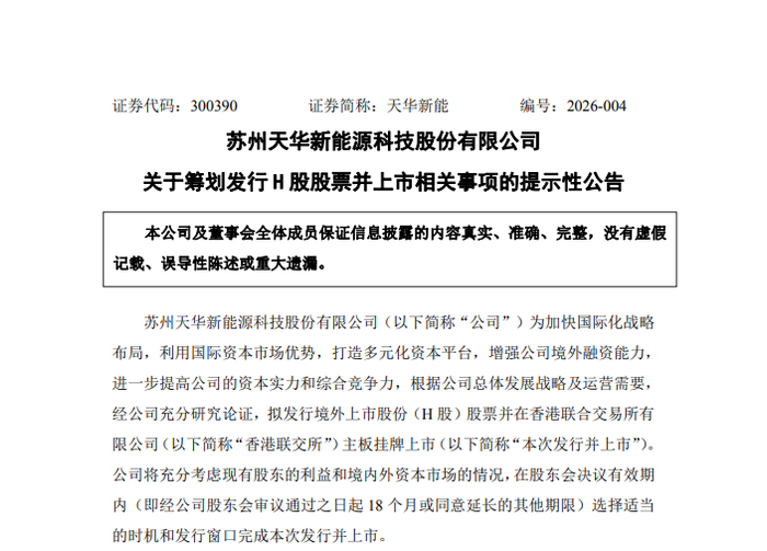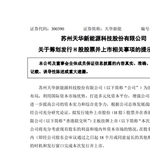 天华新能(300390)3月2日晚间公告,其筹划发行H股股票并上市。公告显示,为加快国际化战略布局,利用国际资本市场优势,打造多元化资本平台,增强公司境外融资能力,进一步提高公司的资本实力和综合竞争力,根据天华新能总体发展战略及运营需要,经公司充分研究论证,拟发行境外上市股份(H股)股票并在香港联合交易所有限公司主板挂牌上市。