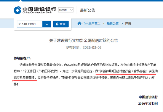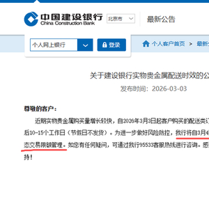 建行公告显示,“近期实物贵金属购买量增长较快,自2026年3月3日起客户购买的配送类订单,发货时间将延长至客户下单后10-15个工作日(节假日不发货)。”
