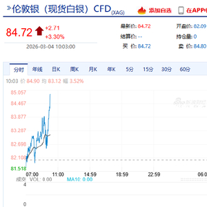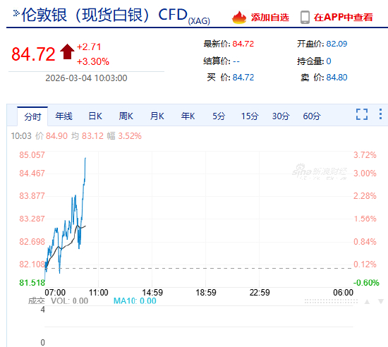 北京时间3月4日上午,现货白银日内涨超3%,现报84.693美元/盎司。