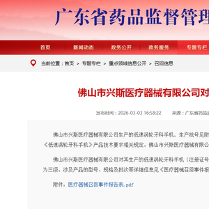 佛山市兴斯医疗器械有限公司生产的低速涡轮牙科手机,生产批号见附件,因经广东省医疗器械质量监督检验所检验发现径向跳动不符合《低速涡轮牙科手机》产品技术要求相关规定。佛山市兴斯医疗器械有限公司决定发起召回。