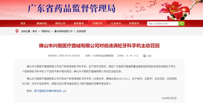 佛山市兴斯医疗器械有限公司对低速涡轮牙科手机主动召回