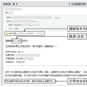 ——标题引诱+紧迫感逼单。岁末年初报销忙、账务急,境外攻击者抓住结算封账的时间点,伪装成电信运营商、电商平台或旅游平台客服,以“收件人姓名+电子发票”为主题构造钓鱼邮件。其中邮件正文中还会特别强调“逾期作废”“发票有误需重开”等字样制造紧迫感,降低警惕性,毕竟在不少人的潜意识里“一张发票能有多大危害”?但真正的陷阱就隐藏在附件或链接中,看似是一份普通的发票文件,实则是境外黑客组织精心伪装的木马程序。