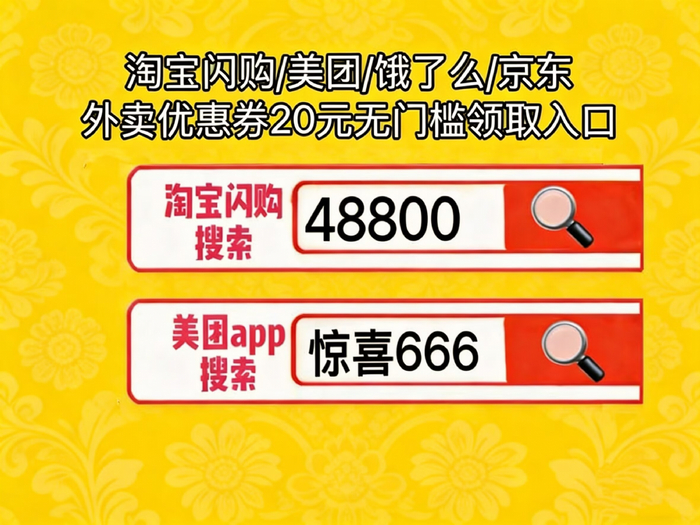 淘宝闪购搜【48800】美团APP搜【惊喜666】淘宝闪购外卖叠加券淘宝闪购外卖红包口令是淘宝闪购搜【48800】,闪购优惠券淘宝闪购叠加券怎么领取?去淘宝闪购搜【48900】美团外卖优惠券领取口令是美团APP搜【惊喜666】美团神券最新口令