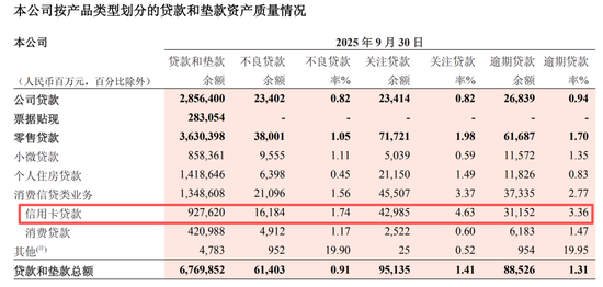资产质量方面,截至2025年9月,招行信用卡不良贷款余额161.84亿元,信用卡贷款不良率1.74%,较上年末下降一个基点。