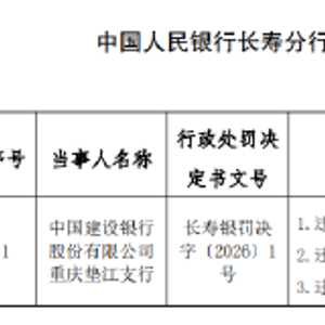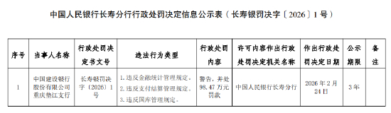 建设银行重庆垫江支行被罚98.47万元:违反金融统计管理规定等