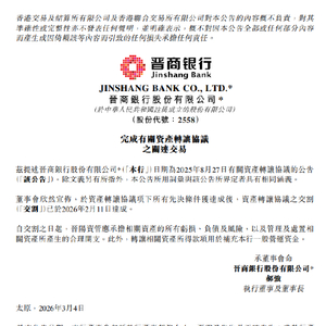 3月4日金融一线消息,晋商银行发布公告,于资产转让协议项下所有先决条件获达成后,资产转让协议之交割已于2026年2月11日达成。自交割之日起,晋阳资管应承担相关资产的所有亏损、负债及风险,以及管理及处置相关资产所产生的合理开支。此外,转让相关资产所得款项用于补充本行一般营运资金。