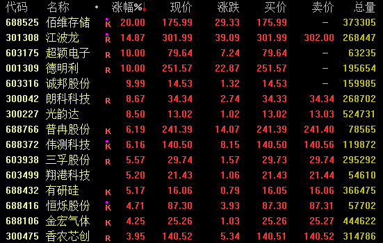 存储芯片概念盘中走势活跃,截至收盘,佰维存储20%涨停,江波龙大涨近15%,超颖电子、德明利均涨停,普冉股份、伟测科技涨超6%。