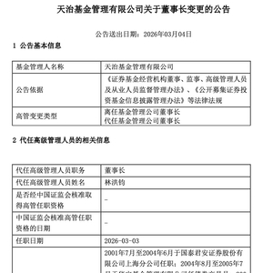 3月4日,天治基金管理有限公司(下称“天治基金”)公告称,公司董事长柴晓秀因个人原因于2026年3月3日离任,且不转任公司其他工作岗位,由总经理林洪钧代任董事长一职。