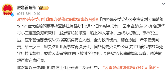 2月17日15时40分许,云南省楚雄市东华镇莲华村小五排莲溪湾度假村一艘涉客船舶倾覆,船上26人落水,造成4人死亡。