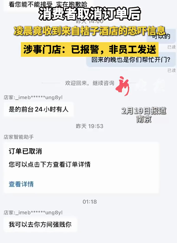 有消费者近日投诉称,她预订了桔子酒店(南京新街口金陵中环店)2月18日—2月19日的房间,但预订后被告知酒店刚完成装修,房间门无法用房卡打开,只能由前台打开,出于安全考虑,她取消了预订,没想到次日凌晨在平台收到了店家的信息恐吓。聊天截图显示,酒店店家于凌晨1点多发送信息称“我可以去你方间强贱你”。
