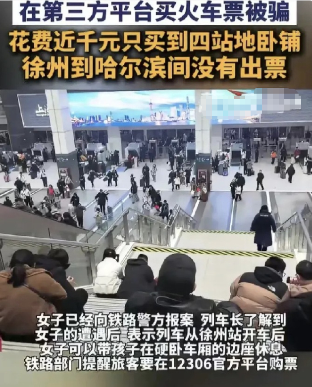 女子在第三方平台购买了上海到哈尔滨的卧铺回老家过年,交费998元后,第三方平台显示出票,当女子带孩子上车后发现被骗——第三方平台只买到上海到江苏徐州硬卧,徐州站之后没有出票。女子随即向铁路警方报案。列车长了解到女子遭遇后,表示列车从徐州站开车后,女子可以带孩子在硬卧车厢的边座休息。