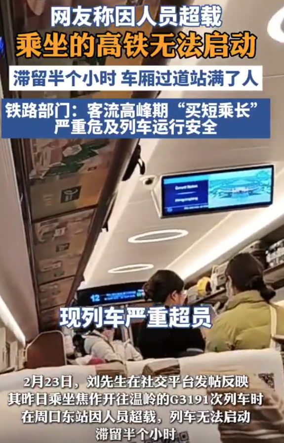 2月23日,刘先生在社交平台发帖反映,其前一日乘坐焦作开往温岭的G3191次列车时,在周口东站因人员超载,列车无法启动,滞留半个小时。刘先生拍摄的视频画面中,车厢过道站满了人,广播里传来列车员的声音:“旅客们,由于列车超员影响运行,请所有无票人员抓紧时间下车。”