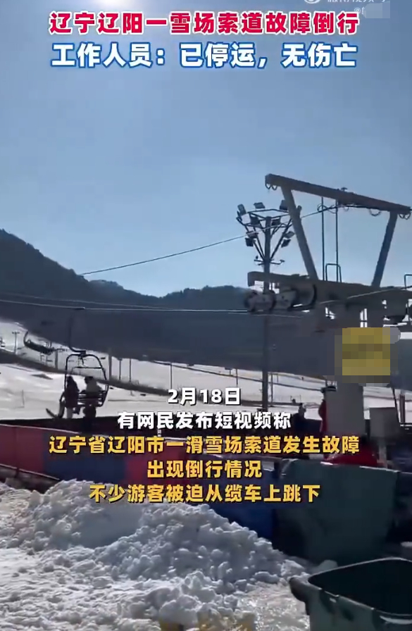 2月18日,有网民发布短视频称,辽宁省辽阳市弓长岭温泉滑雪场索道发生故障,出现倒行情况,不少游客被迫从缆车上跳下。19日,滑雪场工作人员表示,事发于前一日,涉事索道已停运,事故未造成人员受伤,目前雪场正常营业。