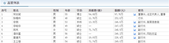 董事长宋剑斌之下,行长张精科带领6名副行长,包括李晓华、陈岚、李炯(兼首席信息官)、潘华富、章建夫、王立雄等。