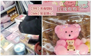 在一家店铺,记者看到一款名为“玫瑰抱抱熊”的捏捏乐玩具,包装上印着“无毒塑胶、安全放心”的字样。商家透露,市场上被称为“假水”“黄油泥”“抱抱奶”等网红产品,其物理性状虽略有差异,但本质上都属于起泡胶类玩具。