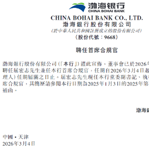 3月4日金融一线消息,渤海银行公告称,董事会已于2026年3月4日审议通过聘任屈宏志先生兼任该行首席合规官,任期自2026年3月4日起至其行长(职业经理人)任期届满之日止。