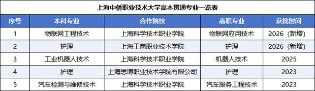 作为上海唯一一所职业本科院校,上海中侨职业技术大学累计共开设5个高本贯通专业,其中今年新增2个高本贯通专业,分别是物联网工程技术、护理专业。其中,物联网工程技术是学校重点建设专业,培养具备物联网系统集成、开发与运维能力的高层次技术技能人才。护理专业则引入临床真实病例与新技术,让学生在真实场景中锤炼康复评估、训练指导等技能,近年来就业率连续数年保持在98%以上,专业对口率90%。