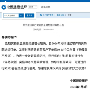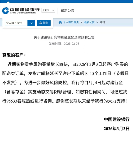 3月3日晚,中国建设银行发布公告称,为进一步加强风险防控,自3月4日起对“建行金”(含“易存金”)业务实施动态交易限额管理。公告还提到,由于近期实物贵金属购买量增长较快,自2026年3月3日起生成的配送类订单,发货时间将延长至下单后10至15个工作日。