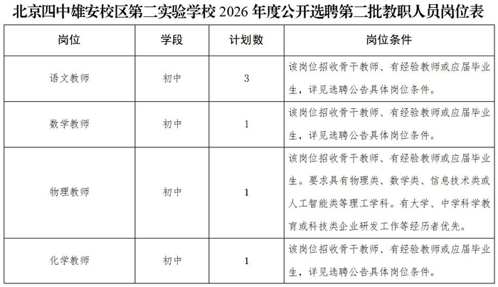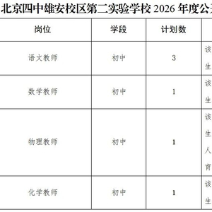 北京四中雄安校区第二实验学校2026年度公开选聘第二批教职人员公告