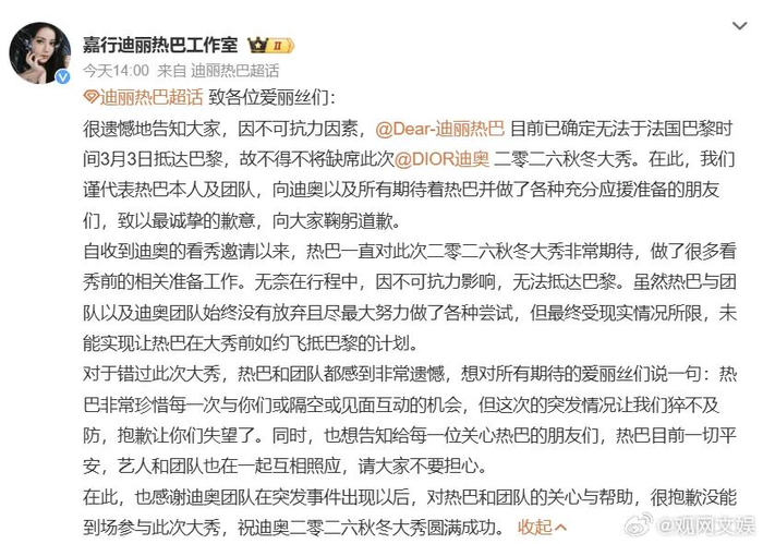 3月3日,迪丽热巴工作室发声:称因不可抗力因素,迪丽热巴目前已确定无法于法国巴黎时间3月3日抵达巴黎,不得不缺席时装周。工作室称热巴目前一切平安,艺人和团队也在一起互相照应,请大家不要担心。