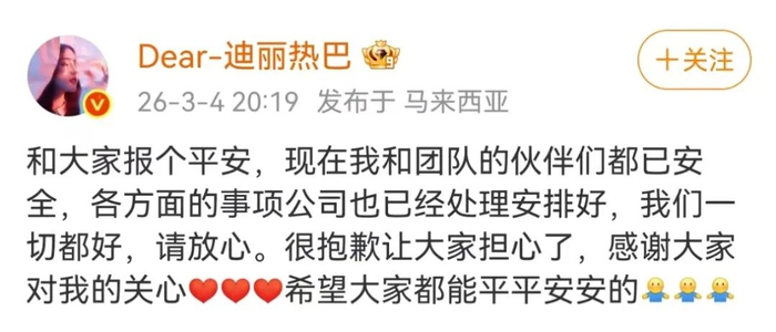 3月4日,迪丽热巴发文:和大家报个平安,现在我和团队的伙伴们都已安全,各方面的事项公司也已经处理安排好,我们一切都好,请放心。很抱歉让大家担心了,感谢大家对我的关心,希望大家都能平平安安的。