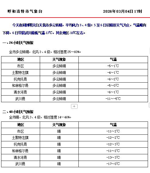 2. 武川及北部地区早晚极寒,户外出行注意防冻,护好头、颈、脚