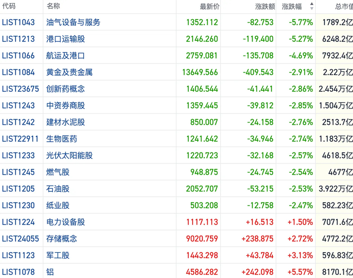 其他方向上,包括大金融、中字头等权重股也开始承压。石油、黄金等避险方向也迎来回撤,航运、油气设备股跟跌。此外,航空、医药、地产等主要行业几乎全线走弱。