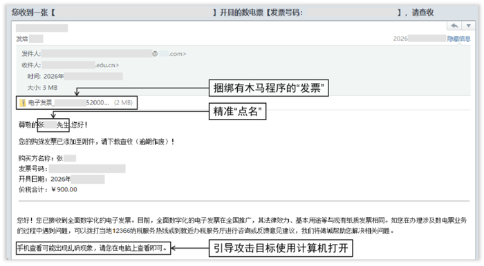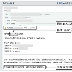 这类邮件伪装度极高,不仅精准使用实名称呼,还在邮件中注“逾期作废”“手机查看可能出现乱码,请在电脑上查看”等诱导性文字,邮件内容、附件名称与正规电子发票几乎完全一致,极具迷惑性。