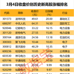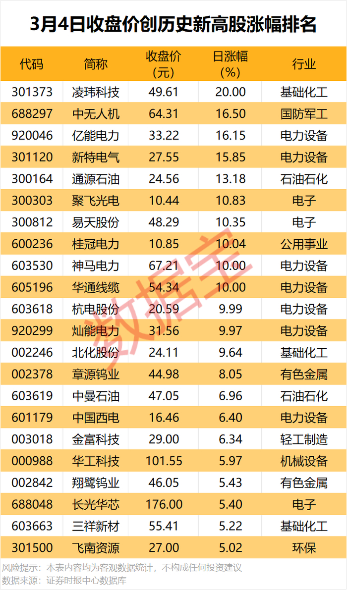 收盘价创历史新高股中,今日股价平均上涨6.53%,涨停的有凌玮科技、桂冠电力、华通线缆等,涨幅居前的有中无人机、亿能电力、新特电气等。