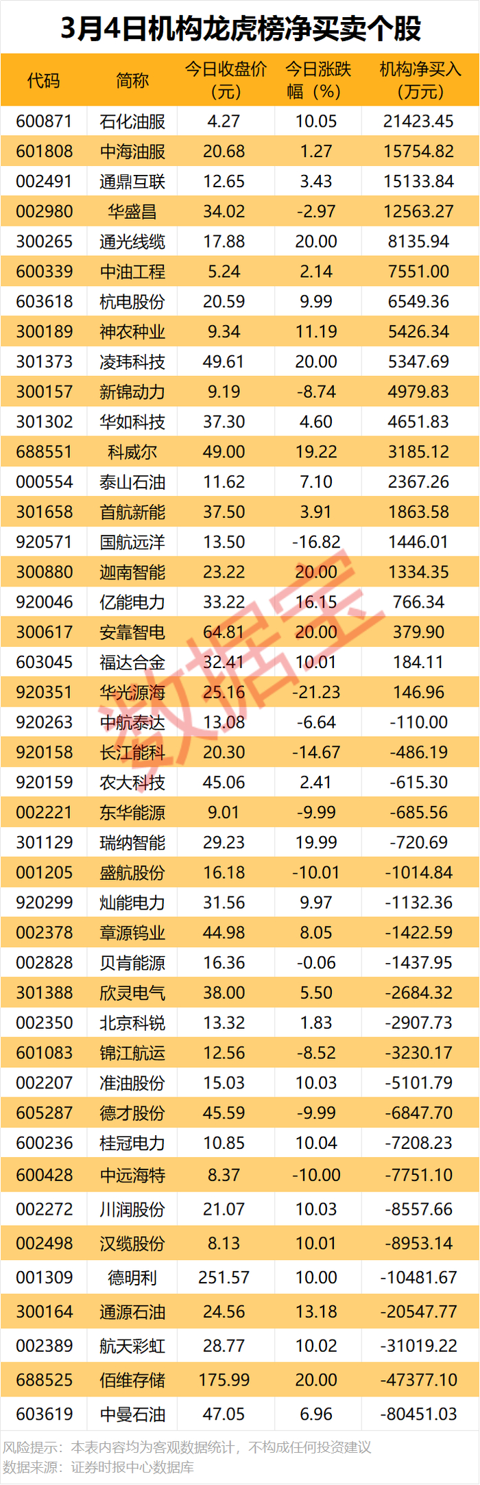 机构净卖出个股中,中曼石油遭机构净卖出8.05亿元,居首;紧随其后是佰维存储和航天彩虹,净卖出金额均超3亿元。