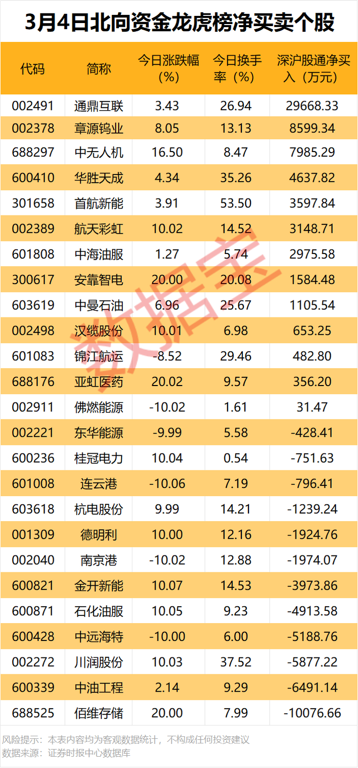 今日龙虎榜现身个股中,13股获北向资金净买入。净买入居首的是通鼎互联,金额为2.97亿元;章源钨业获北向资金净买入8599.34万元,居次席。