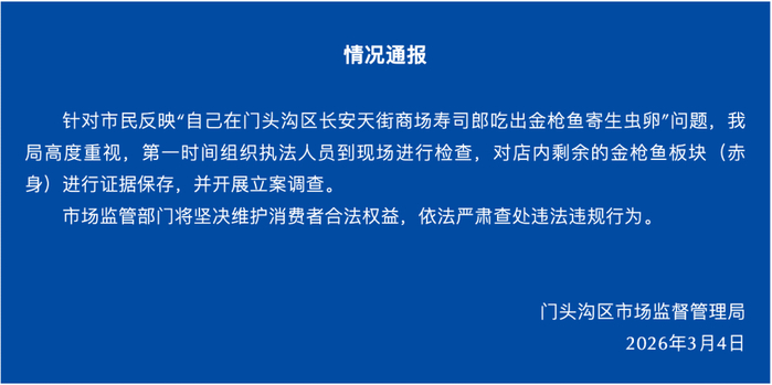 针对市民反映“自己在门头沟区长安天街商场寿司郎吃出金枪鱼寄生虫卵”问题,我局高度重视,第一时间组织执法人员到现场进行检查,对店内剩余的金枪鱼板块(赤身)进行证据保存,并开展立案调查。